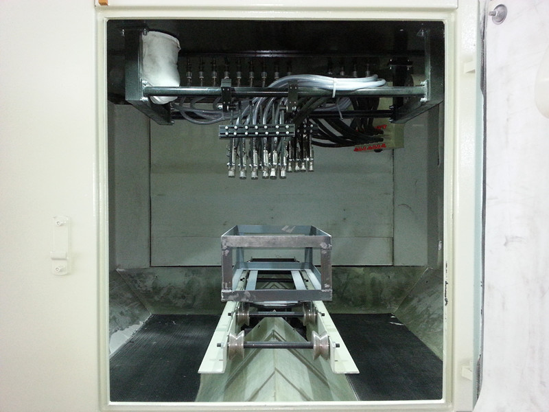 该设备是根据不锈钢水槽产品特性而专门设计的(非标准型)转动式自动喷砂机,完全适合购方所提供的产品。根据购方对产品效率的要求,设备采用转动推车式喷砂机。